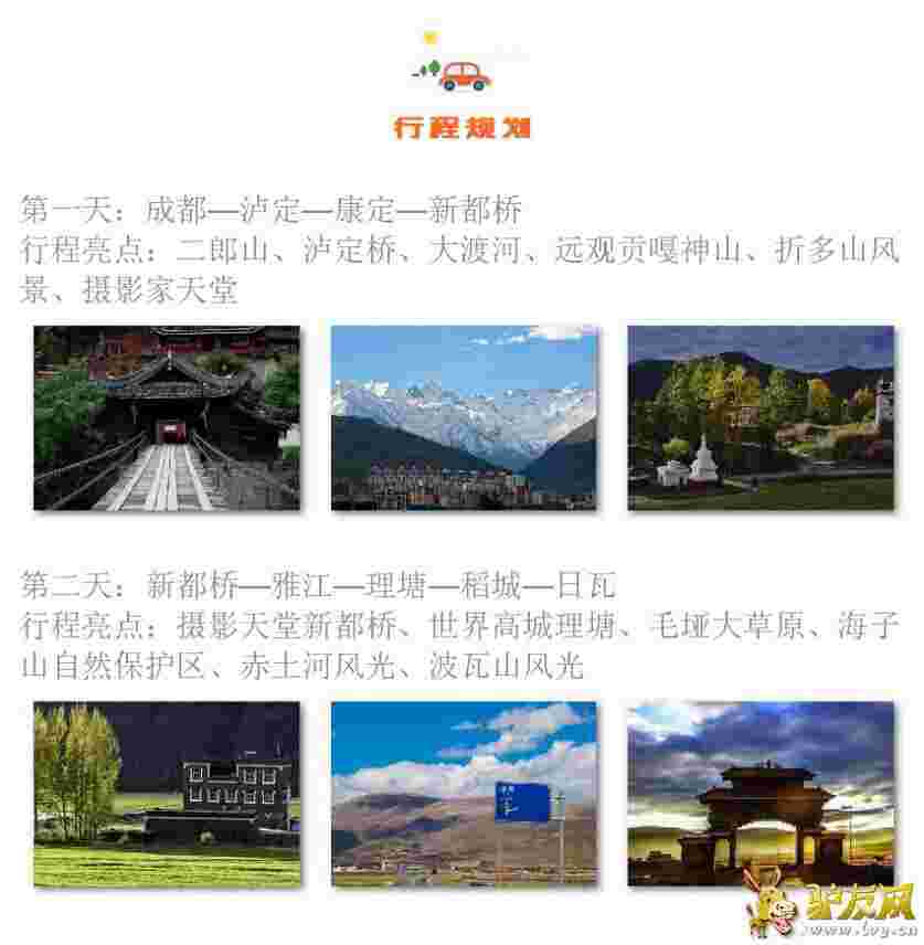 很早就想走這個一次318了,這次終于下定了決定,準備了半個月的假,有沒有人一起的? 拼車拼吃拼住,所有的公用費用都可以拼哦,三三兩兩的組隊從成都走起,先吃個火鍋聯絡一下感情,(音樂起~~~~~)走啊走啊走,好漢跟我一起走,走遍了青山人未老,少年壯志不言愁.......敲門號 saidTnn26 D1:成都·雅安·海螺溝 行程亮點:大渡河、青衣江、摩西古鎮、海螺溝溫泉 D2:海螺溝·康定·新都橋 行程亮點:海螺溝景區、紅石灘、折多山、新都橋 D3:新都橋·理塘·稻城·香格里拉鄉 行程亮點:新都橋、海子山、傍河、萬畝楊樹林、山路十八彎 D4:亞丁景區一日游 行程亮點:三大神山、諾絨牛場、牛奶海、五色海、珍珠海 D5:香格里拉鄉·稻城·理塘·巴塘 行程亮點:毛埡大草原、姊妹湖 D6:巴塘·芒康·左貢 行程亮點:金沙江、瀾滄江大峽谷 D7:左貢·邦達·八宿·然烏 行程亮點:邦達草原、九十九道拐、怒江大峽谷、然烏湖 D8:然烏湖·米堆冰川·波密 行程亮點:然烏湖、米堆冰川、古鄉湖 D9:波密·魯朗·八一 行程亮點:魯朗林海、魯朗石鍋雞、色季拉山 D10:八一·工布江達·拉薩 行程亮點:米拉山口、尼洋河、拉薩河 D11:拉薩·羊卓雍錯·拉薩 行程亮點:羊卓雍錯